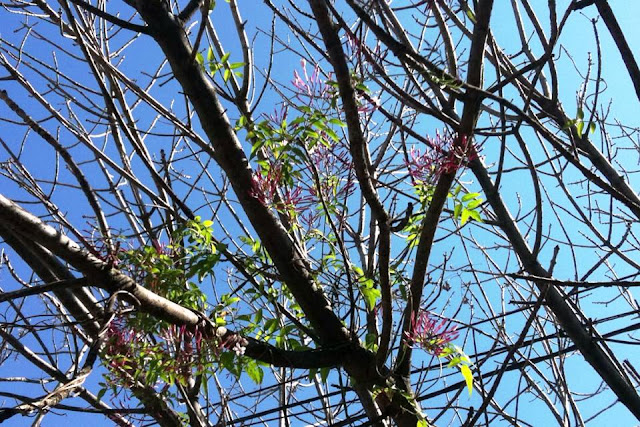 El fresno tendría las ramas sin hojas si no fuese porque lo atrapó un jazmín del país que subió directamente desde la reja que da a la vereda, se enredó, se enredó, se enredó, y ahora florece alto y blanco sobre las ramas negras.